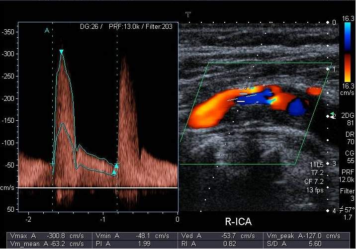 In the majority of the cases, stroke is causes by the atherosclerotic lesion of the supplying arterial system of the brain. Ultrasound examination can reliably depict a long segment of the four main extracranial large vessels supplying the brain. Fortunately, most atherosclerotic lesions that causes cerebrovascular symptoms are to be found in the carotid bifurcation and therefore they can be well diagnosed on carotid US examinations. Besides depicting plaques, US can measure their size and assess their composition. Lipid-rich plaques that are covered with a thin, easily rupturing fibrotic cap are considered instable, but inhomogeneous structure and irregular surface are also a poor prognostic factor. Exulceration, a consequently appearing excavation on the surface of the plaque carries the highest risk for embolization. Color Doppler examination can help precisely define the contours of plaques. It can clearly depict the residual lumen of the narrowed arterial segment and it is able to confidently differentiate between complete obstruction from high grade stenosis. Contrast enhanced ultrasound examination can show the angiogenesis at the basal part of instable plaques as well as MRI examination. One of the main diagnostic goals of cerebrovascular imaging is to determine the grade of stenosis of the internal carotid artery, since the risk of stroke grows parallel with the grade of the stenosis, which can be avoided with reconstructive surgery or with stent implantation. A 50% diameter decrease is considered the limit at which point a stenosis counts as hemodynamically significant. Below this the grade of stenosis can be well estimated with 2D planimetric measurements. Above this level stenotic lesions are quantified by their hemodynamic effect, based on the measurements of flow velocity increase. If a significant stenosis is discovered, the patient must be closely followed. At a stenosis of about 70% surgical or interventional procedure should already be considered. In these cases, or when diagnosis is equivocal, it is important that the duplex sonography is followed by an imaging method that can visualize the cerebrovascular system in full.