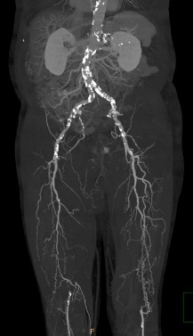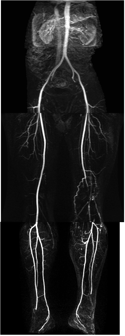 Multi-slice CT is able to perform CT angiography scans that map the body from the diaphragm to the ankles depicting the complete arterial tree with adequate intensity and with appropriate spatial resolution. In most cases this has a sufficing diagnostic value and it is especially advantageous for the rapid assessment of patients in poor condition. For the MRA of this wide region a special table toggling technique is required. This method applies prolonged injection of intravenous bolus contrast medium, and in three table-toggling steps it can visualize the arterial system of the abdominal aorta and the peripheral arteries up to the ankle with an acceptable spatial resolution. MRA examinations has the best diagnostic value for lesions presenting at the aortoiliac and femoropopliteal regions in cases with a relatively limited extension and a reasonable severity. CTA examination (with specific contrast injection protocol) provides better spatial resolution tough even in this region starting to replace angiography as a first choice of examination in the diagnostics of acute coronary syndromes.