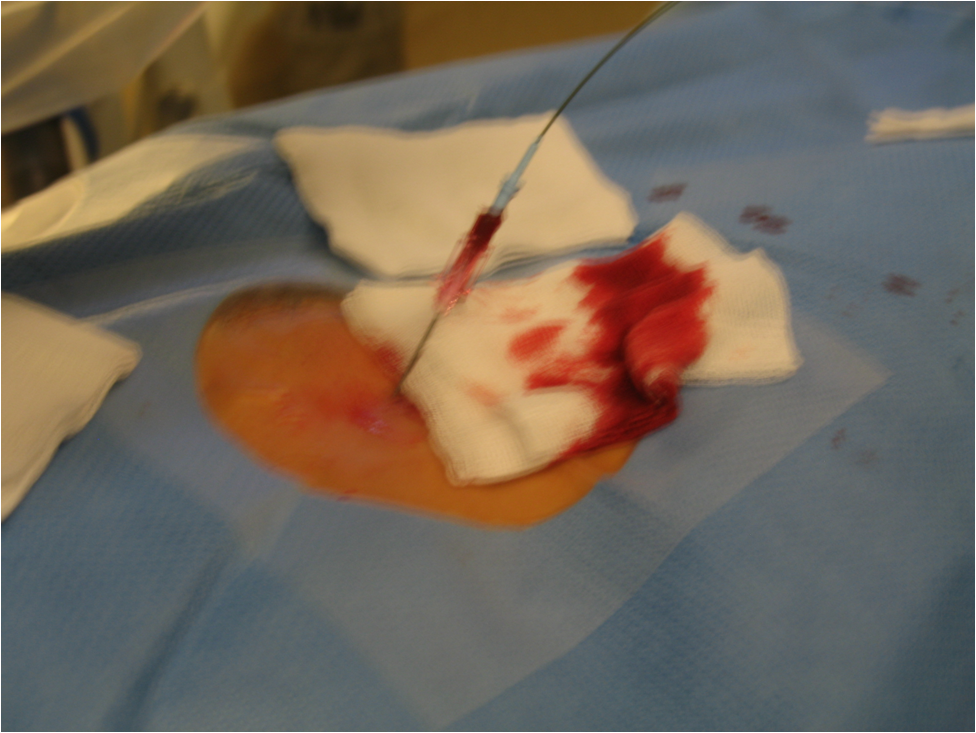 Seldinger technique is used for vascular access. Arterial puncture by a Seldinger needle (Fig 1, Upper row, left panel) is most often pulse-directed (by palpation), but can be accessed by ultrasound guidance. Most commonly used access sites are common femoral and brachial arteries, radial arteries are used mostly by cardiologists, popliteal artery can be rarely punctured in special cases (retrograde recanalisation of superficial femoral artery occlusion). A guidewire is inserted into the needle (Fig 1, Upper row, right panel), the needle is withdrawn (Lower row - left panel) (at this point the puncture site should be compressed to prevent bleeding); a few mm dissection may be done by a scalpel, the introducer sheath and then a catheter is fed onto the guidewire (Lower row - right panel); then the guidewire can be withdrawn and contrast medium can be inserted through the catheter. More information on contrast medium is available in chapter 7.