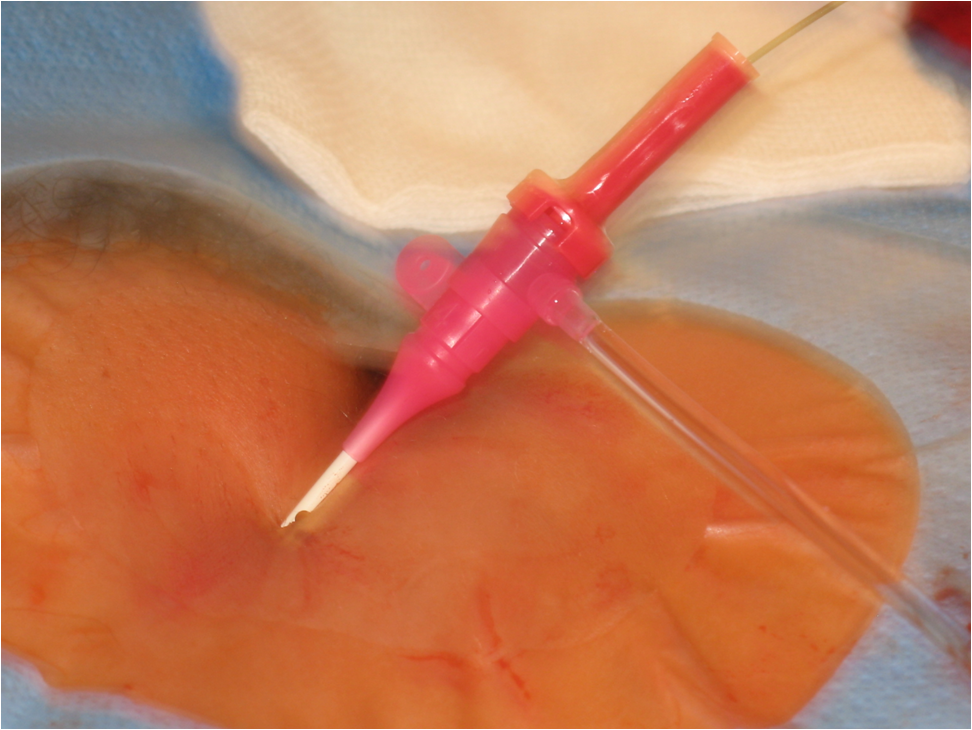 Placement of chronic venous lines and ports in Hungary are usually done by anethesiologists, whereas in many countries in Europe and in a few centers in Hungary it is performed by interventional radiologists; image-guidance (US-guided puncture, fluoroscopy guided placement of the catheter tip) reduces the risk of complications. Chronic venous access is necessary when chemotherapy, antibiotic therapy or total parenteral nutrition is needed for a number of weeks or months. The advantage of port is that it is placed into a subcutaneous pouch (as opposed to the Hickman line, which has a large portion of the catheters outside the skin) thus the quality of life of the patient is much better. The port is (almost) invisible, regular lifestyle including showers and swimming is possible, it can be used for many months or even 1-2 years, and it can be punctuted more than 1000 times; the catheter is tunneled from this pouch to the internal jugular vein or the subclavian vein; the tip of this catheter is in the distal portion of the superior vena cava (Figure 10). Most important immediate complications at these procedures include PTX, inadvertent arterial puncture, venous wall perforation, air-embolism, catheter malposition; delayed complications include infection, venous stenosis, formation of thrombus or fibrin sheath.