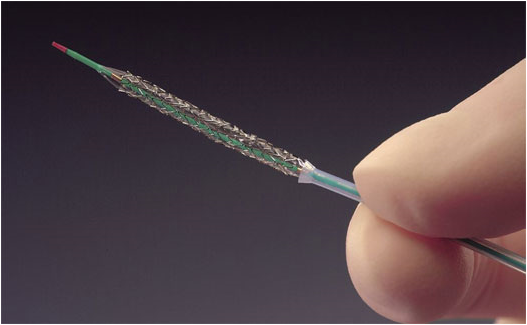 Stents are elastic metal meshes (Fig.3, upper right and lower right panel), which remains permanently in the artery. In terms of mounting and delivery, there are two major types: balloon-expandable and self-expanding. Studies indicate that stents decrease the rate of restenosis and also the risk of distal embolisation. Covered stent (or stent-graft) is a bare stent covered with prosthesis material, therefore it is a tube, rather than a mesh. Covered stents are used for minimal invasive treatment for aneurysms (e.g. thoracic or abdominal aortic or popliteal aneurysm), but arterial injury, rupture or pseudoaneurysm can also be treated using covered stents.