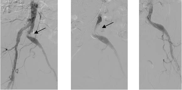 Figure 4. Primary stenting of an 80-90% stenosis on the distal portion of the left common iliac artery distal stenosis. Left and middle panel: stenosis is indicated by the arrow. Contrast medium was given from the aorta proximal to the stenosis (left panel) or the left common iliac artery distal from the stenosis.