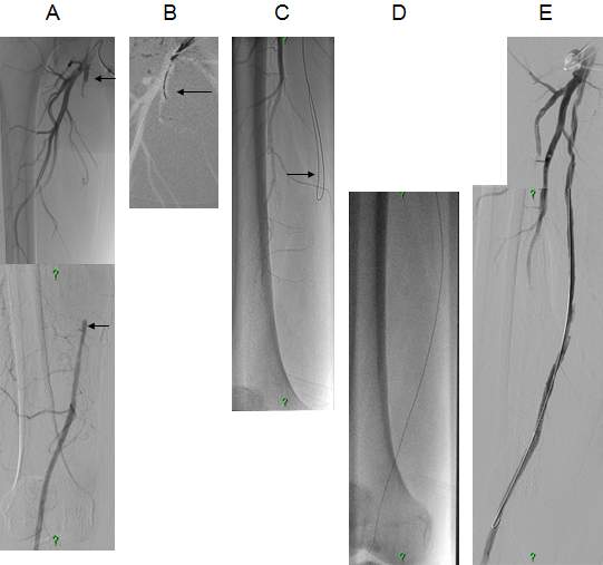 Figure 5. Subintimal percutaneous transluminal angioplasty (PTA). Panel A: Superficial femoral artery has been occluded from its origin with a stump (upper arrow). Refilling occurs at the distal SFA (lower arrow), total length of the occlusion is approximately 18 cm. Panel B: The white background („roadmap”) shows the profunda femoral artery. The guidewire (in black on the white background; arrow) is at the beginning of the occluded segment. Panel C: the guidewire forms a loop (arrow), and gradually proceeds into the subintimal space. Panel D: the tip of the guidewire reached the normal popliteal artery lumen, there is no loop formation any longer. Panel E: Following balloon dilation of the whole segment, SFA shows quick flow in its entire length.