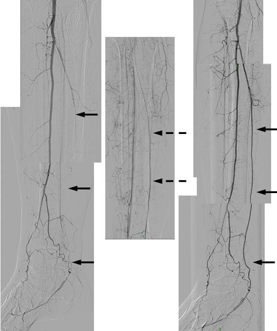 Figure 6. Crural PTA. Left panel: the only crural vessel filling is the peroneal artery; the posterior tibial artery is filled only in the proximal segment; the plantar arch in its continuation is also filled. Middle panel: successful recanalisation of the posterior tibial artery was performed using the guidewire (dashed arrow). Right panel: following balloon dilation, posterior tibial artery is well filled (arrows).