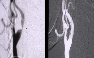 Figure 7. Carotid stenting: DSA angiography image before and after stenting (courtesy of prof. K. Hüttl, Semmelweis University).