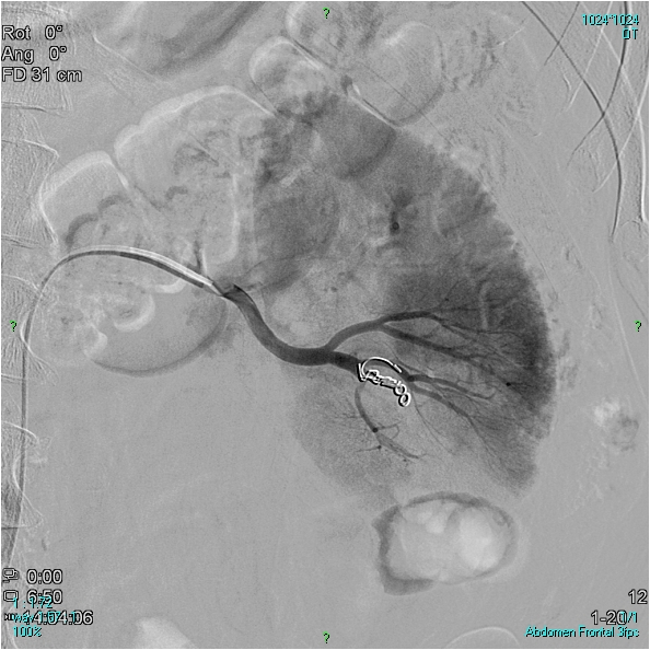 Figure 8. A 55-year old male patient had resection of a 2,5 cm tumor from the left kidney. Macroscopic hematuria developed, which was repeatedly present. In the lower third of the left kidney, at the site of the former operation, contrast enhancement shows severe intraparenchymal bleeding (Panel A: catheter in the proximal position, Panel B: catheter in more distal position). The small arterial branches responsible for the bleeding were occluded using two metallic coils (Vortx-35, 3x7x67 mm, Boston Scientific) (Panel C). Urine was clear of blood within a few days, other treatment was not necessary. The only other altervative treatment would have been nephrectomy.