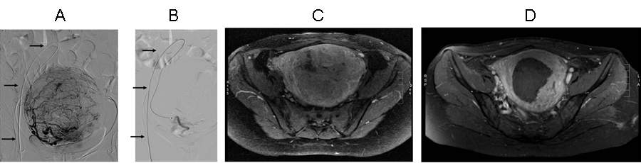 Figure 9. Uterine artery embolisation due to symptomatic fibroid. Panel A and B: angiography before (A) and after (B) embolisation; arrows point to the catheter. Panel C and D: T1 weighted, contrast enhanced axial MR image before (C, myometrium and fibroid are both enhancing) and 5 months after embolisation (D, myometrium is enhancing, fibroid is no longer enhancing contrast medium; fibroid is considerably smaller in size).