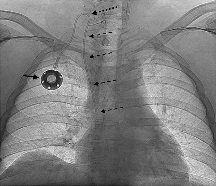 Figure 10. Port implantation. The port chamber is indicated by the solid arrow. The plastic catheter from the port chamber is directed through a subcutaneous tunnel into the internal jugular vein and the superior vena cava (dashed arrows). Internal jugular vein was punctured using ultrasound guidance.