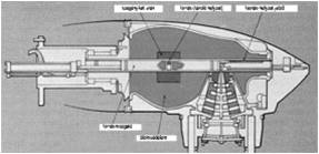 In the magnetron the central cylindrical cathode is surrounded by the anode block made of copper, with a cylindrical cavity between them. In the anode block, the resonant cavities have a circular layout. The magnetron is placed in a homogenous magnetic field, perpendicular to the plane of the figure. The electrons, emitted from the central hot cathode, are moving to the anode on a complex way by the effect of DC pulses and the magnetic field. In case of resonance, high power, high frequency oscillation created, which can be coupled to the accelerator tube through the waveguide with the appropriate antenna. Usually a few hundred 2-5