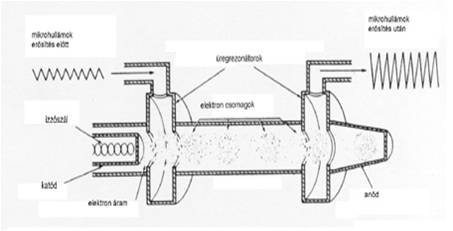 The klystron is not a high frequency generator, it is a microwave amplifier. It has two cavities (buncher and catcher) connected by a tube. The low level microwave to be amplified enters on the cathode side, and it modulates the electron beam velocity, so the electrons arrive to the second cavity sorted in compact bunches. In the second cavity the electron bunches are decelerated resulting in a high-power microwave, which has the same frequency as the input signal. 5-30 MW power can be reached with this unit.