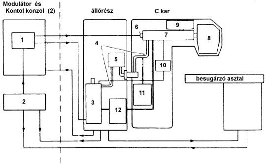 The most important units of the linear accelerator are illustrated on the block diagram: 1. pulsed power supply, 2. control console, 3. klystron, 4. wave guide, 5. circulator, 6. electron gun, 7.accelerator structure, 8. magnet and treatment head, 9. vacuum system, 10. automatic frequency control (AFC) system, 11. pressure system, 12. cooling water system (upper left modulator = modulator cabinet; middle: állórész = stand; right: C kar = gantry). The injection system is the source of electrons (electron gun) and the accelerated electrons are drifting through the anode into the accelerating wave guide. The electrons arrive in bunches in the proper time, and accelerated in the waveguide by the transmission of RF power. The length of the waveguide depends on the technique of acceleration. In the travelling wave devices, an electric field parallel to the waveguide is used. The slow bunches only take a short way in unit time, and the cavities close to the electron gun are relatively short. Later as the bunches are accelerating practically to the speed of light, longer cavities are required. At the end of the tube, the energy has to be absorbed or fed back to the input end of the waveguide. The well-defined electron beam energy is the advantage of this system. The disadvantages are the long waveguide, which makes the keeping of the bunch’s convergence more complicated, and only rotating drum suspension available.
