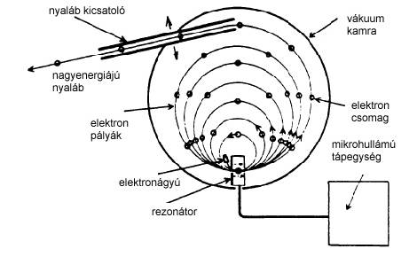 Microtron. The microtron is a circular accelerator with only one resonating cavity. Electrons passing through this cavity are forced to an orbit in a homogenous magnetic field, and they are passing through the cavity repeatedly. The radius of the orbit is increasing with the speed of the electrons, and if appropriate energy is reached, the beam extracted by using a deflection tube. The beam can be used as electron beam with appropriate energy, or with appropriate target (Bremsstrahlung) an X-ray beam is produced. The improved version uses a multiple cavity system (race track microtron), with the same principles of operation. Its significance can be best characterized with the figures: while about 500 linacs are installed, only 1-2 microtrons are produced in a year.
