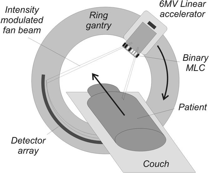 Tomotherapy: The principle of operation is the same as that of the spiral-CT; the radiation source is a low energy linear accelerator. It is adjusted with a binary MLC.