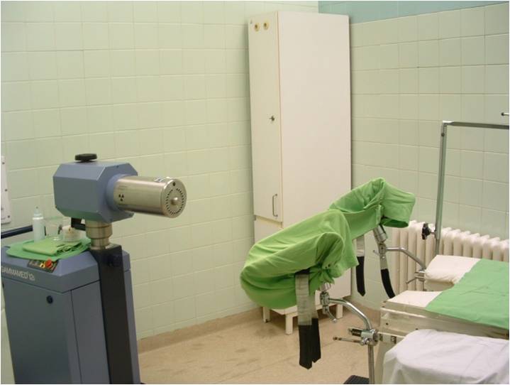 The main parts of the afterloading machines are: The source-moving device, the channel selector, source container, source-leading tubes and applicators and the computerized controlling device. The installed system, in addition to locking mechanisms, is completed by security devices. The inactive (dummy) source is also a part of the modern afterloading machine’s security system, which is used to verify all sources moving before the irradiation. Moving the point source, arbitrary source can be created, only the stepping times have to planned by an irradiation planning program. The common source is 192Ir and 60Co (less common). The Iridium source’s initial activity is usually 370GBq, that of the cobalt source is 37 GBq. Greater specific activity can be reached with iridium, and therefore it can used with many types of applicators including needles. The disadvantage of this type is that in an institution with larger patient throughput a source replacement required in every 3 months. Because of the cobalt source’s lower specific activity, the charge’s size is bigger, that’s why it is not suitable to prickling, but it is suitable for intracavitary therapies (oesophagus, rectum, gynaecological treatment) The frequency of the charge’s replacement is only specified by the quality of the fixation on the mover cables.